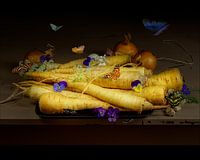 Foto-collage van pastinaak en peterseliewortel met uien, fluitenkruid en viooltjes op een eenvoudige tafel close-up gefotografeerd. Clair obscure. Met vlindertjes.