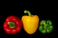 Stilleven peper rood geel groen op zwarte achtergrond met waterdruppels