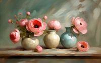 Impressionistisch schilderij met een stilleven met vazen en pioenrozen in zalmroze en zacht groene tinten.