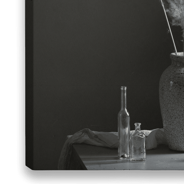 Stilleven horizontale foto van een grote grijze vaas met craquelé met daarin 3 grote grijs neutrale pluimen op een grijsblauwe tafel met 2 glazen flesjes en een dunne gebroken linnen lap. Alles tegen een donkere achtergrond.