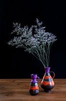 Paarse takjes en twee vintage vazen in de kleuren oranje en paars. Deze kleurige vazen uit de seventies zijn een gewild verzamelobject en passen erg mooi in het huidige interieur. De vazen zijn bekend als "West Germany" keramiek, het is dus in Duitsland geproduceerd.