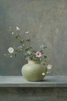 Stilleven | Quiet Elegance in Bloom - Dit bloemen schilderij toont een sereen stilleven met een subtiele vaas in een zachte groene kleur, sierlijk gevuld met diverse bloesems en bladeren die een gevoel van delicate eenvoud uitstralen.