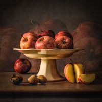 Stilleven van rode, fijn gestreepte appels op een schaal met voet. Een beeld zomaar op een namiddag van een keukentafel met wat walnoten, waarvan een gedeeltelijk in de bijna droge schil. Een rode appel in de achtergrond en een appel met een partje op de voorgrond. In de achtergrond een vervaagde projectie van een vergroting van de appels op schaal.