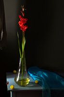 Stilleven foto verticaal van een rode gladiool in een glazen druppelvormige vaas op een grijsblauwe tafel met een blauwgroene organza doek en witte pruimen tegen een donkere achtergrond.