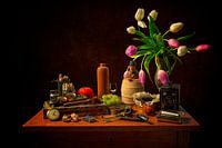 Een tafel met oud rookgerei: Rookpot, pijp en pijptabak, pruimtabak, sigaar, sigaretten. Ook een bos tulpen een oude fotocamera, een oud brilletje en een zakhorloge liggen op de tafel.