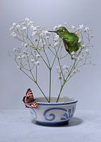 "Royal Flinderia Stilleven" is een betoverend kunstwerk gemaakt door de getalenteerde kunstenaar Sander van Laar. Dit kunstwerk bevat een oud-Hollands schaaltje dat is verfraaid met barsten van bladgoud. In dit prachtige tafereel komt de symboliek van de kolibrie naar voren, die staat voor de vreugde van het leven en de lichtheid van het bestaan. Deze symboliek wordt harmonieus gecombineerd met de aanwezigheid van gipskruid, een bloem die staat voor standvastigheid, vriendschap en een puur hart.