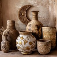 Stilleven met vazen,kruiken en een halve maan in een rustieke stijl met bruin en goud tinten.
