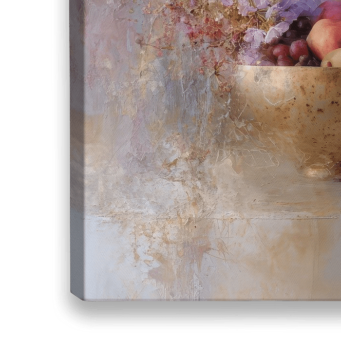 Voeg een vleugje romantiek en verfijning toe aan je interieur met dit impressionistische stilleven schilderij. In het midden van het kunstwerk staat een sierlijke kom gevuld met vers fruit zoals appels, druiven en perziken. Rondom de kom slingeren…
