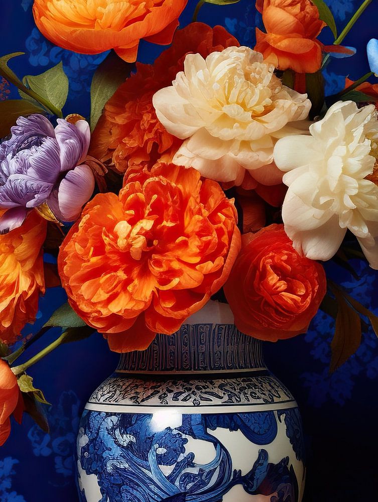 Details: bloemen, Delfts blauw, vaas, oranje, blauw, wit, erfgoed, verfijning, contrast, luxe