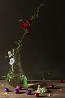 Stilleven foto verticaal van een donkerrode stokroos in een dunne glazen vaas met een tak pispotjes. Op een houten tafel met daarop pruimen en hortensia. Alles tegen een donkere achtergrond. Als je goed kijkt zie je insecten en vlinders.