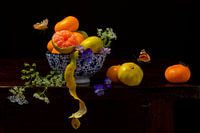 Foto-collage horizontaal, Clair obscure, van een blauw-wit gebloemde kom met daarin en naast sumari mandarijnen met fluitenkruid en viooltjes en vlinders op een donkere houten tafel close-up