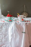 Stilleven foto verticaal van een wit gedekte tafel met daarop twee theekoppen met rode bessen erin. Tegen een neutrale achtergrond met een antieke taartschep.