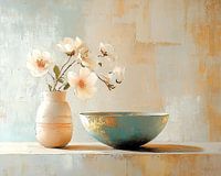 Stilleven | Tranquil Existence - Dit stilleven schilderij toont een rustgevende compositie van een vaas met tedere, witte bloemen naast een grote, verweerde kom op een tafel, allemaal tegen een harmonieus oudroze en crèmekleurig achtergrond die rust en sereniteit uitstraalt.