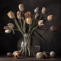 Stilleven met een glazen vaas in sfeervolle verlichting met glanzende tulpen in voornamelijk bruin,taupe en zacht oranje en geel tinten.