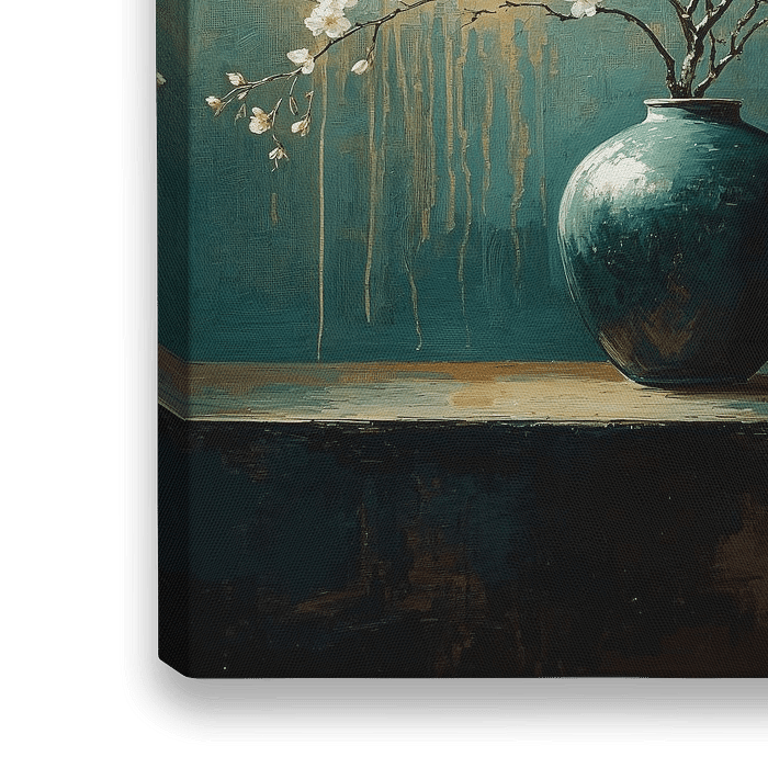 Een sfeervolle compositie waar een robuuste turquoise vaas het centrale punt vormt, gevuld met sierlijke takken kersenbloesem. De witte bloemen contrasteren prachtig tegen een mysterieuze achtergrond in diep turquoise en goudtinten, waarbij subtiele druppels verf een dramatisch effect creëren. Het schilderij ademt een perfecte balans tussen Oosterse sereniteit en hedendaagse expressie.