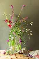 Stilleven verticale foto van een lange ranke druppelvormige vaas met daarin een los veldboeket met oa een stokroos en Camille. Samen met rode besjes op een houten tafel tegen een neutrale groenige achtergrond.