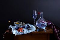 Stilleven horizontale foto van verse vijgen op een stuk wit papier met een buikfles en een champagneglas en een aardewerken bakje met daar in een witte pruim. Op een donkere houten tafeltje met auberginekleurige fluwelen lap en donkere achtergrond.