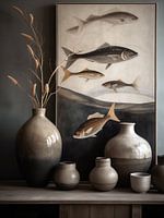 Stilleven in voornamelijk bruin en beige tinten met vazen en kommen op een tafel en een ingelijste print illustratie met vissen.