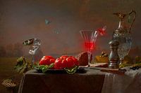 Stilleven horizontaal fotocollage van een tinnen bord met daarop vleestomaten op een met linnen gedekte tafel met een glas liqeur een tinnen zoutmolen en een oude kristallen wijnkarafe brood en olijven met op de achtergrond vaag een vlak avondlandschap met rood rose kleurende lucht