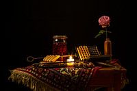 Vandaag gaan we wafels bakken met geweckte kersen en een oud wafelijzer. Op de tafel liggen noten en staat een roos in een vaas.