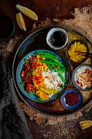 Stilleven verticaal recht van boven genomen foto van een koperen dienblad met daarop een blauwe kom met een eenvoudige maaltijd van rijst met runderstoof haricots verts en paprika met daarbij 4 kleine schaaltjes met sojasaus sambal atjar en yoghurt-dip op een juten en donkere achtergrond met droge rijst en citroenpartjes