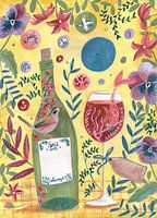 Een leuke illustratie met een wijnfles en een glas rode wijn. In het glas zwemt een zeemeermin en op de fles zit een vogel. De fles staat op een geruit tafelkleed wat op tafel ligt en daarachter een gele achtergrond gevuld met bloemen en planten en mooie viooltjes en grappige gekleurde stippen. Een vrolijk geheel voor in de keuken of boven de eettafel in de eetkamer. Origineel acrylverf op papier.