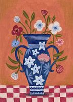 Een gedecoreerde delfts blauwe vaas met witte rode en roze bloemen tegen een terracotta gekleurde achtergrond. De pot staat op een rood wit geblokt tafelkleed. Origineel acrylverf op papier