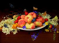 Stilleven horizontaal foto-collage Clair obscure van een oud Bretons handbeschilderd bord uit Quimper met daarop wilde perziken en aardbeien omringd door vlierbloesem en wilde bloemetjes op een donkere houten tafel. Als je goed kijkt zie je insecten en vlinders