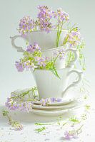 Stilleven van drie gestapelde koppen en schotels met sleutelbloemetjes erin gestoken en eromheen uitgestrooid tegen een witte ondergrond. De ultieme uitdaging om een werk te maken met witte koppen en schotels en achtergrond. Zo eenvoudig en sereen als maar mogelijk.