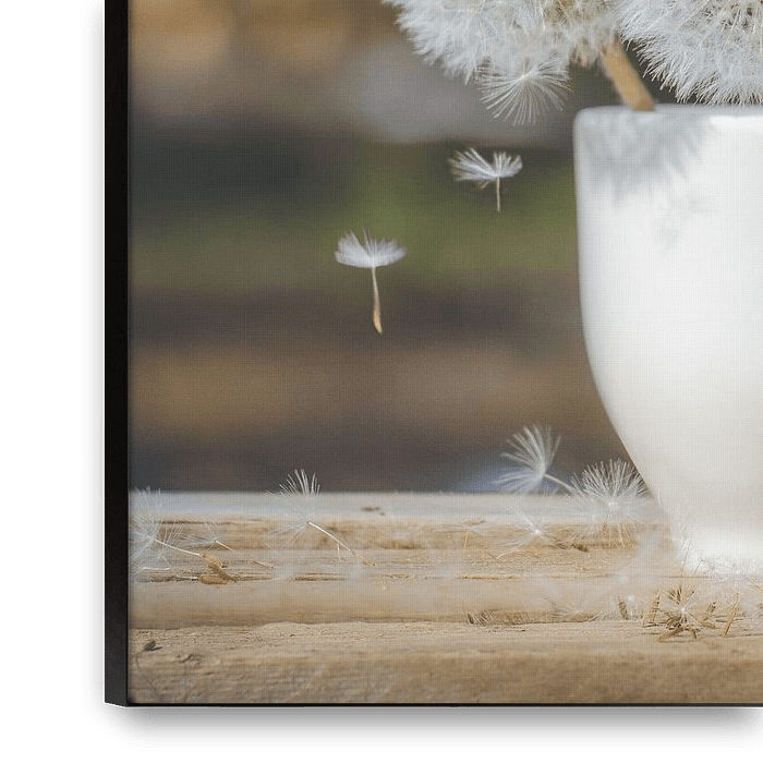 Delicate uitgebloeide paardenbloemen in een kopje. De paardenbloemenpluisjes wiegen zachtjes in een zuchtje wind.