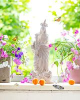Stilleven verticaal van een witte vensterbank met geopende ramen met op de vensterbank een oud Mariabeeld en aan beide zijden een vaas met Lathyrus. Abrikozen en vlinders.