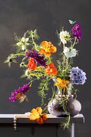 Stilleven verticale foto van een kleurrijk zomers boeket met vlinderbloemen, oostindische kers, hortensia, lobelia en juffertjes in t groen. Alles in een kleine tinnen vaas waar een parelketting omheen gedrapeerd is. Op een grijze tafel tegen een neutrale achtergrond met daarin vaag een wolkenlucht. Als je goed kijkt zie je vlinders en een rups.