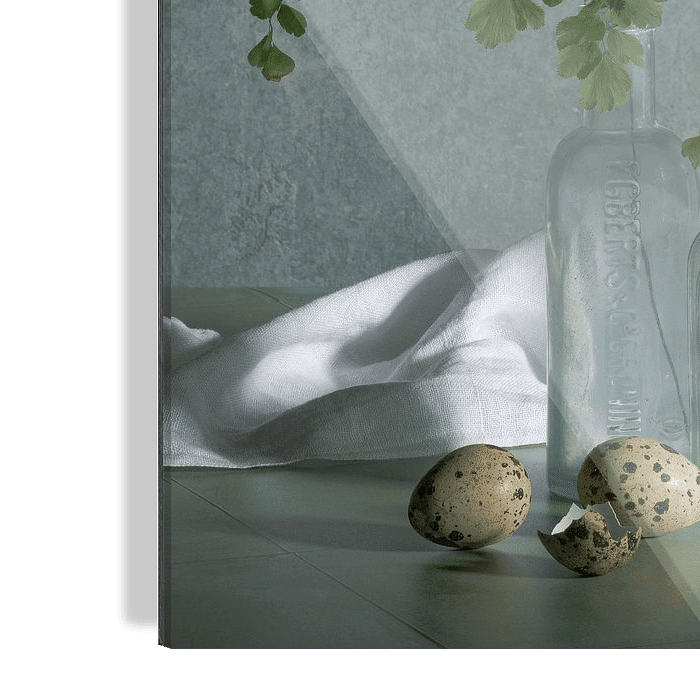 Uit mijn serie: Early Dew. Een stilleven in zachte kleurstelling en al zijn eenvoud. Met de schoonheid van viooltjes en kievitseieren. De combinatie met zacht groen is een uitstekende kleurcombi voor een moderne, landelijke en klassieke uitstraling. Een echte blikvanger bij u aan de keuken of huiskamermuur?