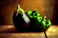 Aubergine en groene paprika's hangen in zachte aardetinten en hun heldere kleuren schitteren in het warme licht. Deze harmonieuze collectie kan de creatieve energie stimuleren van een keuken of eethoek waar culinaire dromen vorm krijgen. Een uitnodigende blikvanger die de eetlust opwekt en gasten in verrukking brengt!