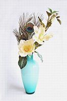 De blauwtinten in de pauwenveren matcen mooi met het blauw van de vaas.