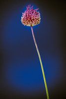 Een artistieke bewerking van een solo bloem met bordeauxrode en gele bloemen in een overdaad aan blauwe achtergrond passend in een modern interieur met blauwe of grijze tinten.