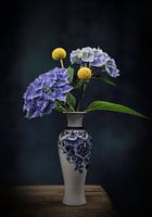 Foto van een Delfts blauw vaasje met blauwe hortensia's en craspedia's. Digitaal bewerkt met een donkerblauwe achtergrond