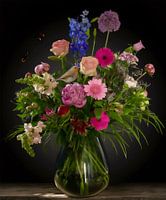 Boeket bloemen in de kleuren roze en paars in een vaas van glas op een oud houten bankje met een zwarte achtergrond