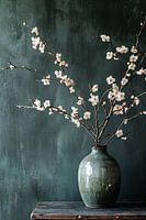 Dit prachtige stilleven toont een verfijnde groene vaas gevuld met delicate bloesemtakken, ideaal voor een rustgevende en minimalistische inrichting. De harmonie tussen het groen van de vaas en de subtiele wit-roze tinten van de bloesem creëert een serene en elegante uitstraling. Dit ontwerp straalt eenvoud en verfijning uit en past perfect in interieurs met een moderne, minimalistische of Japandi-stijl. Of het nu in een woonkamer, eetkamer of hal wordt geplaatst, het trekt meteen de aandacht en voegt een vleugje natuurlijke schoonheid toe aan elke ruimte.