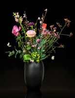 Foto van een mooi boeket bloemen in voornamelijk roze kleur. In een zwarte vaas. Digitaal bewerkt met zwart / donker bruine achtergrond en vlinders