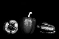 Stilleven drie paprika's naast elkaar op zwarte achtergrond in zwart-wit