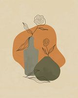 Stilleven illustratie van twee bloemen in een groen-grije fles en een groene vaas, met op de beige achtergrond een grote, orange form, en op de voorgrond twee bladeren. De bloemen en bladeren zijn met donkergroene inkt getekend, de rest van de illustratie is met aquarelverf geschilderd met een zichtbare textuur.