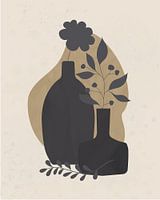 Minimalistische illustratie van een stilleven van een bloem en een takje met bladeren en kleine bessen in 2 flessen. Een tweede takje is op de voorgrond, en een grote organische vorm op de achtergrond.