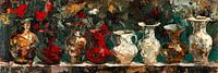 De kleuren contrasteren sterk met de achtergrond, waardoor de vazen en bloemen opvallen en de aandacht van de kijker trekken. Het geheel straalt een gevoel van georganiseerde chaos uit, waarbij de verschillende elementen harmonieus samenkomen. Dit kunstwerk nodigt de kijker uit om de interactie tussen kleur, vorm en textuur te verkennen en de schoonheid van alledaagse objecten op een nieuwe manier te zien. De artistieke interpretatie en de expressieve techniek geven het schilderij een unieke en boeiende uitstraling, die zowel rust als energie uitstraalt.