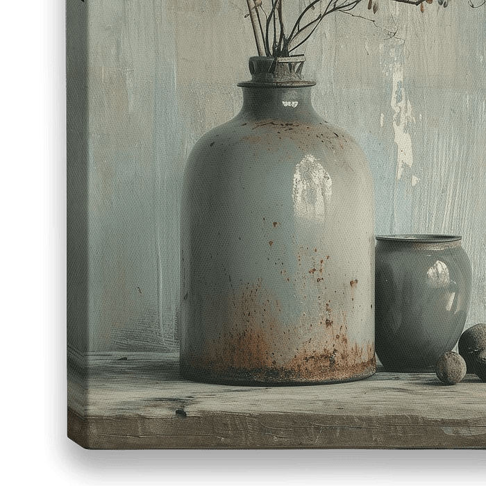 Stilleven in Japandi en wabi-sabi stijl. Lichtblauwe tinten. Kies zelf het formaat en materiaal en maak er een echte blikvanger van voor jouw interieur.