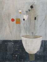 Stilleven in Japandi stijl, illustratie. Speelse illustratie van een vaas met bloemen. Abstract, nieuw landelijk. Kies zelf het formaat en materiaal bij dit werk.