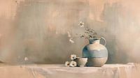 Stilleven in Japandi stijl in wit. Een bijzonder sfeervol en minimalistisch stilleven met witte bloemen. Kies zelf het formaat en materiaal bij dit werk en maak het helemaal naar wens.