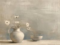 Stilleven in Japandi stijl in wit. Een bijzonder sfeervol en minimalistisch stilleven met witte bloemen. Kies zelf het formaat en materiaal bij dit werk en maak het helemaal naar wens.