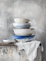 Stilleven in Japandi stijl van een stapel borden in wit en blauw. Een bijzondere blikvanger voor je interieur! Kies zelf het formaat en materiaal bij dit werk en maak het helemaal naar wens.
