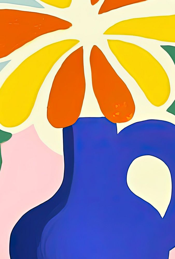 De achtergrond is een zacht perzikroze canvas dat de perfecte achtergrond biedt voor de levendige kleuren van de vaas en bloemen. De vaas zelf is in een diepe, koningsblauwe tint geschilderd, met een opvallende witte vlek die zowel licht als een artistieke flair toevoegt. Uit de vaas komen abstracte bloemvormen in oranje, geel en wit, die samen een uitbundige en vrolijke bloesem vormen.